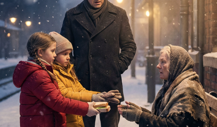 Na železniční stanici bosá bezdomovkyně třásla zimou… dokud k ní nepřišly dvě malé dívky — a ten okamžik jí úplně změnil život.