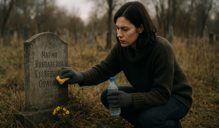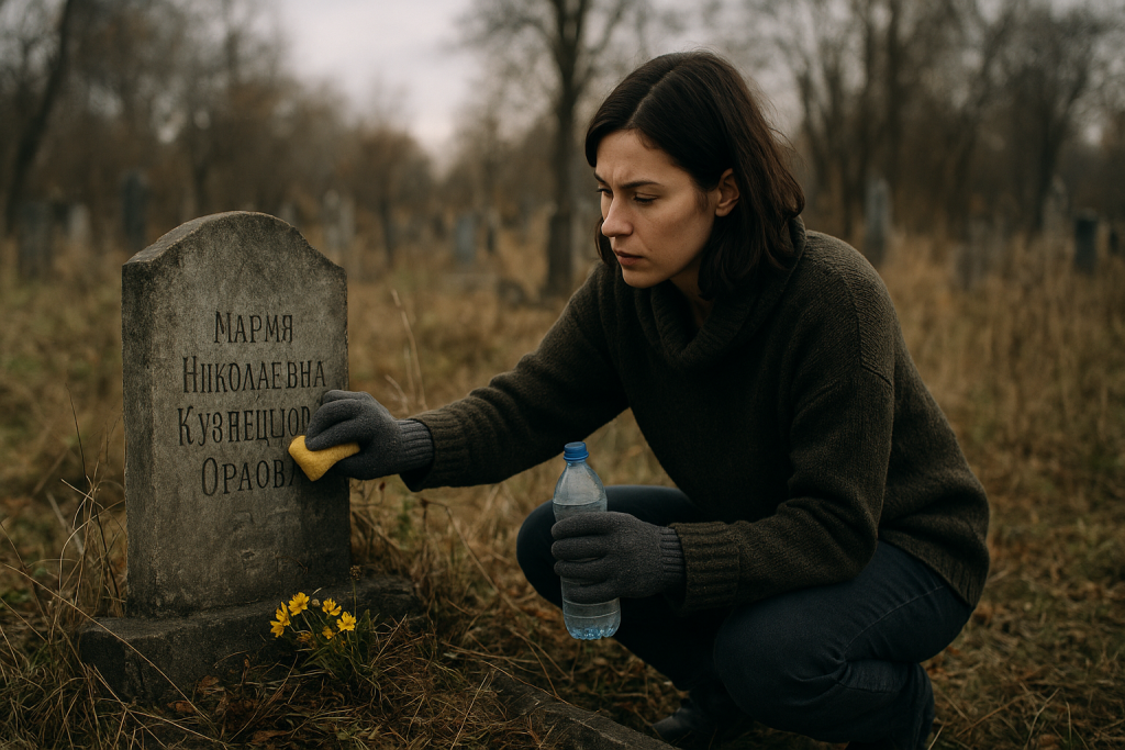 Přistoupila blíž a přečetla jméno: Maria Nikolajevna Kuzněcovová Orlovová. Žádná péče, uvadlé květiny, zapomenutý kámen. S podivným pocitem začala Alena hrob čistit. Otřela prach, odstranila trávu. Když odcházela, pocítila mrazení… jako by ji někdo sledoval.