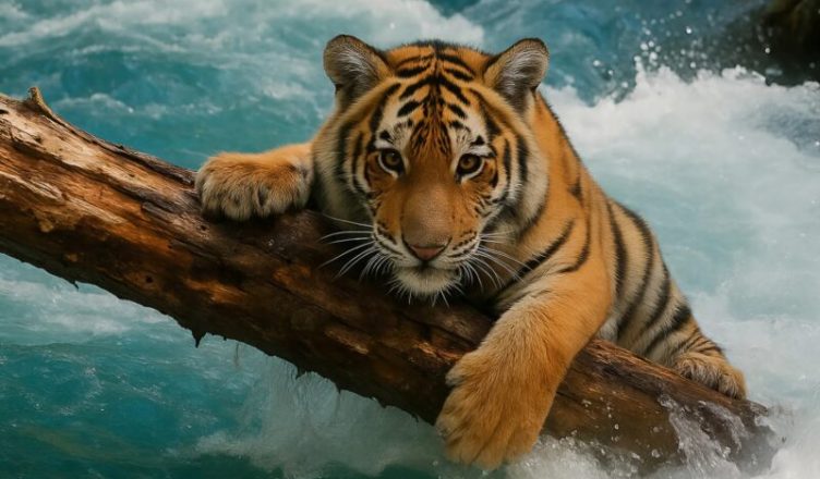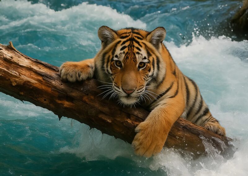 Studený, prudký proud ho zmítal jako hračku. V zoufalství se tygřík zachytil packami o kus větve trčící z vody. Jeho drobné drápky se zatínaly do kůry, oči měl rozšířené hrůzou a srdce mu bušilo tak, že se zdálo, jako by mělo vyskočit z hrudi.