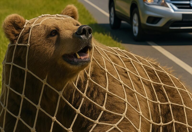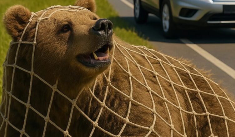 Noha sama přitlačila plyn, ale při druhém pohledu jsem pochopil: medvěd tam jen nesedí – byl zamotaný v husté síti. Provazy mu svíraly ramena i tlapy, srst měl rozcuchanou do chomáčů, těžce dýchal a vrčel, jako by prosil o pomoc.