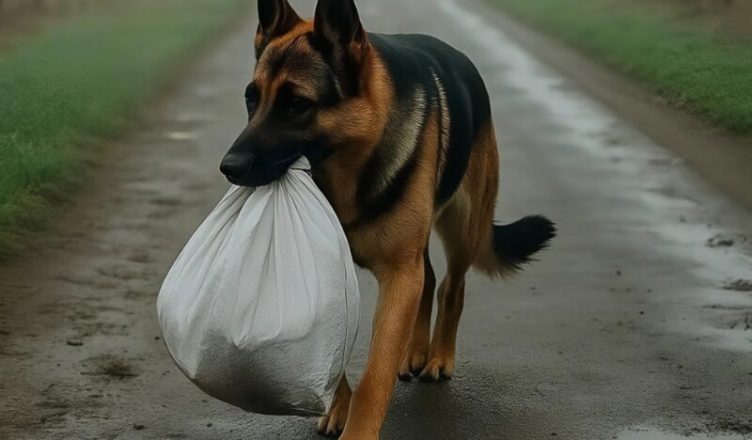 Zpoza zatáčky se objevil německý ovčák. Šel sebejistě, nevšímal si ničeho kolem a pevně držel v zubech velký bílý balík. Balík vypadal těžce — pes kráčel pomalu, ale rozhodně.