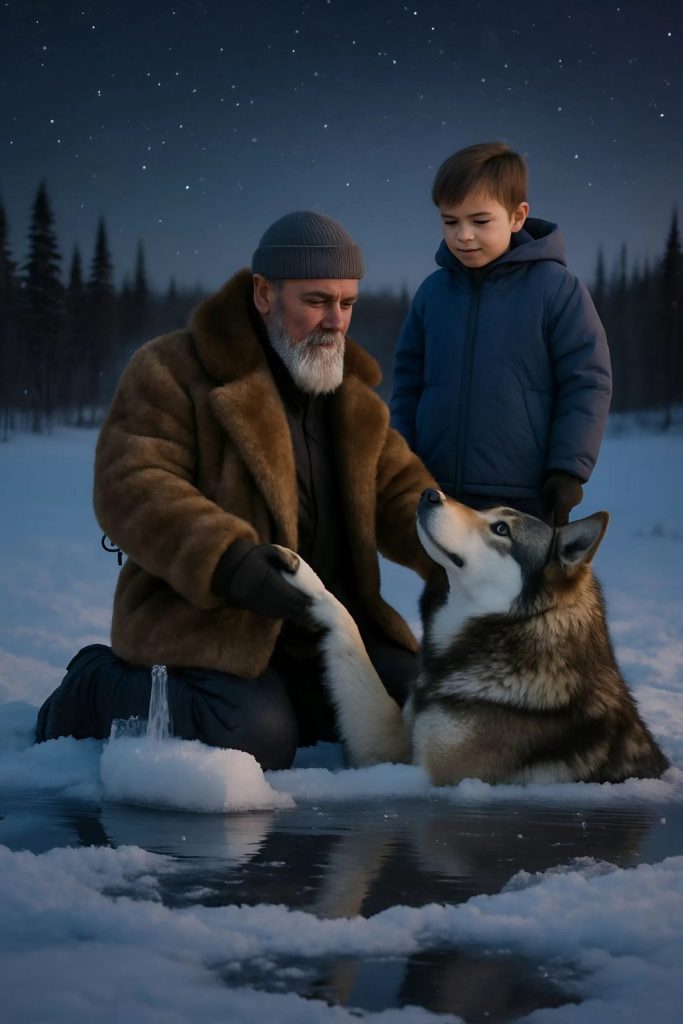 Po dlouhé hodině se led prolomil. Ivan zvíře vytáhl ven — těžké, promrzlé, téměř bez dechu. Položil ho na sníh a přikryl vlastním kabátem.