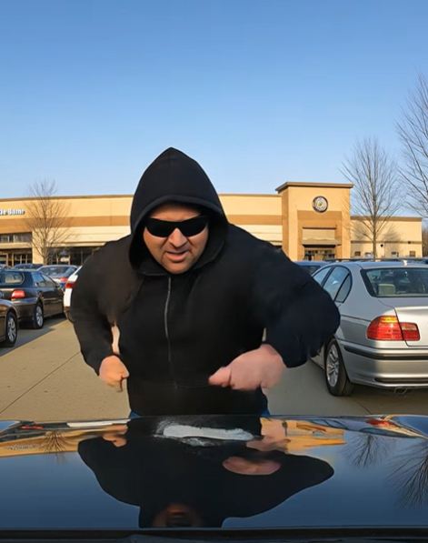 Z kapsy vytáhl předmět, který na první pohled vypadal jako nůž. Ne dlouhý, spíše ostrý nástroj. Přiložil ho k povrchu auta a začal ryt do kapoty jakési symboly. Pomalu, trpělivě, jako by prováděl dávno připravený rituál. Kov skřípal, škrábance se rýsovaly a kamera jasně ukazovala podivné znaky – kruhy, čáry, jakési ornamenty, které nedávaly smysl.