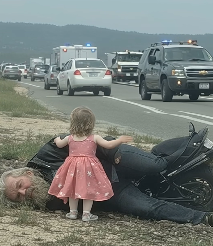 A kislány ekkor még szorosabban átölelte a földön fekvő férfit, és csak ennyit suttogott: „Most már nem árthat senki neki.” Az emberek ledermedtek. A motorosok megálltak, leszálltak gépeikről, és ahogy közelebb jöttek, egyértelművé vált: nem voltak idegenek. A férfi, aki az árokban feküdt, a konvoj tagja volt.