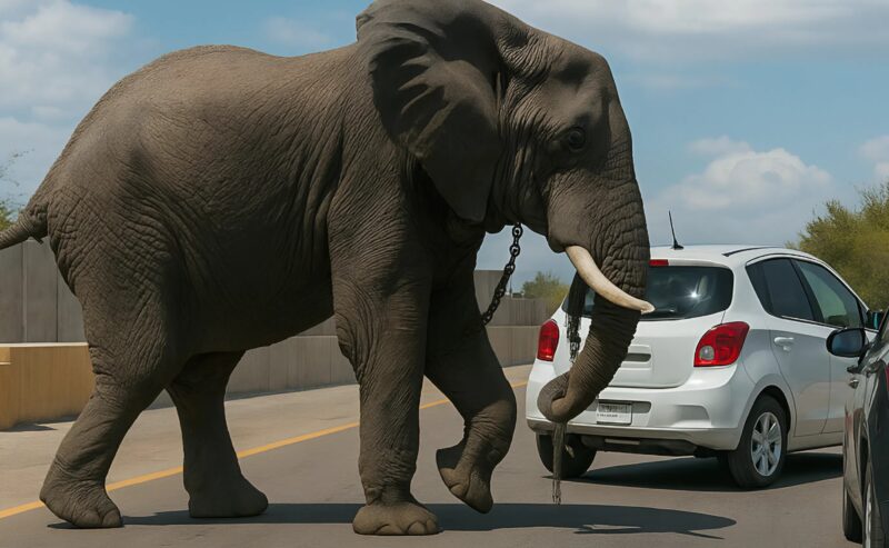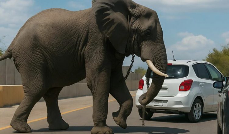 Pod spalujícím sluncem se provoz náhle zastavil. Řidiči troubili, někteří se vykláněli z oken — uprostřed silnice stál obrovský slon. Nervózně mával ušima a najednou udeřil chobotem do bílého auta. Nárazník se rozbil, lidé v panice couvali, někteří křičeli, jiní vše natáčeli na telefon.