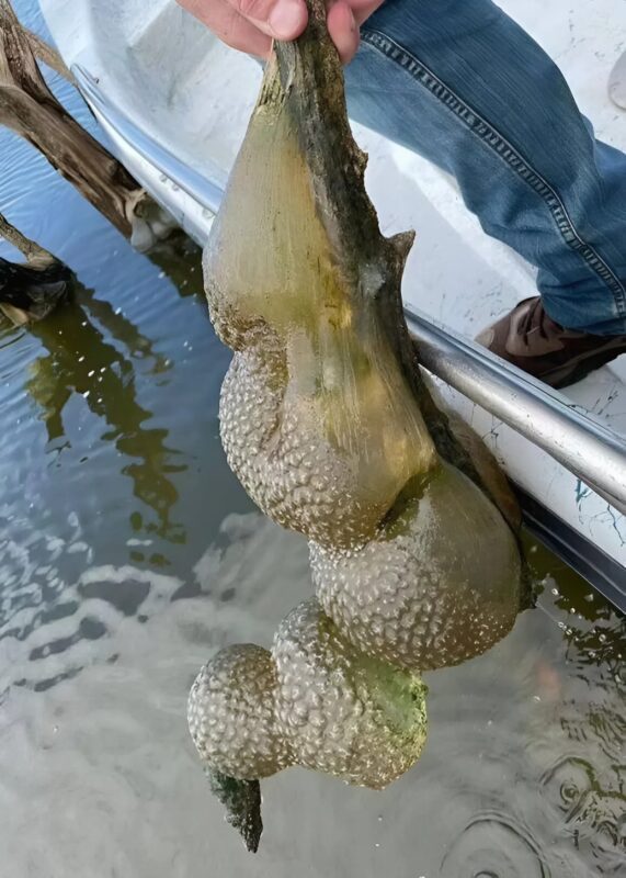 Běžné letní ráno v Oklahomě se proměnilo v senzaci, když si rybáři při procházce kolem jezera McGee Creek všimli něčeho podivného: z kořenů stromů přímo ve vodě visely poloprůhledné váčky připomínající vejce s pevnou skořápkou.