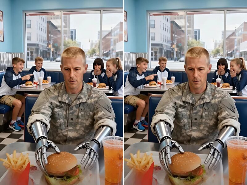 Atmosféra u stolu se postupně vyostřovala — každý nešikovný pohyb vojákových protéz dělal situaci ještě trapnější, a teenagerům to zřejmě připadalo jako zábavná hra.