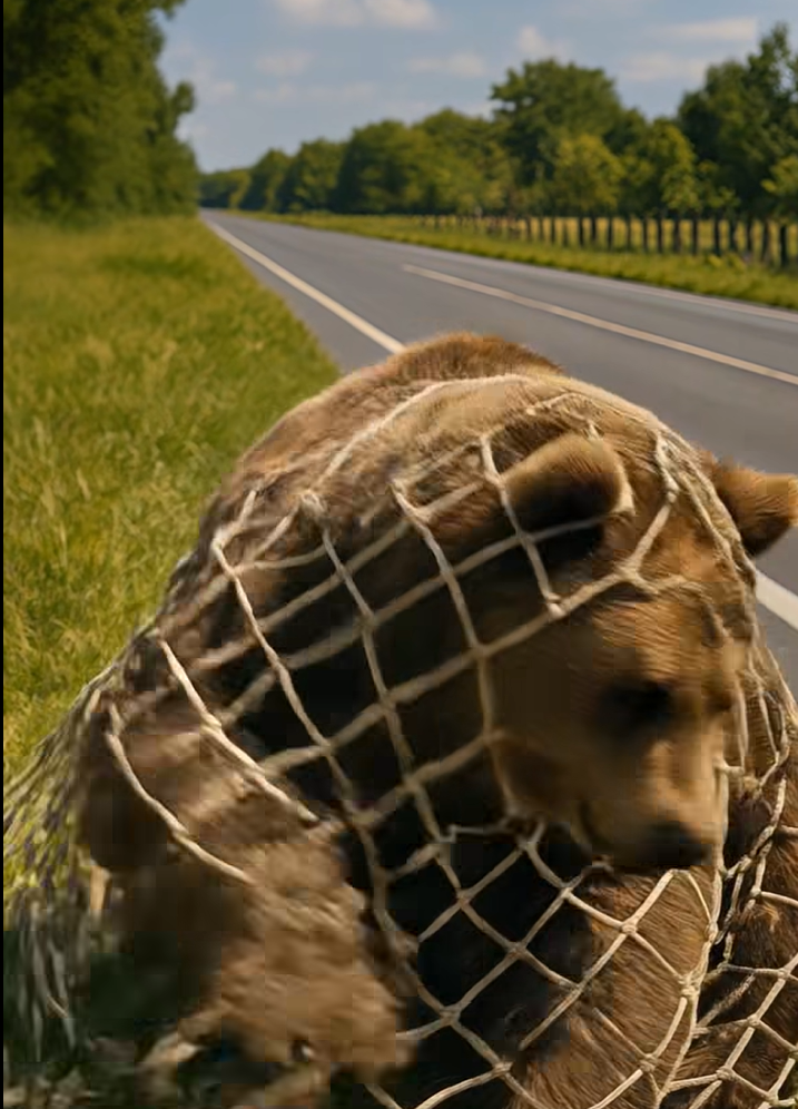 Bylo časné ráno, mlha ještě ležela na polích a asfalt mezinárodní dálnice se leskl rosou. Tato silnice vede podél hustého lesa, o kterém každý ví, že je domovem vlků a medvědů. Pro řidiče už to není překvapení – občas zahlédnout stín velké šelmy není v těchto místech nic neobvyklého.Když jsem se blížil k zatáčce, koutkem oka jsem zahlédl hnědou skvrnu na kraji silnice. Myslel jsem si, že jde jen o kus dřeva nebo velký kámen. Přidal jsem plyn, ale pak jsem si všiml, že skvrna dýchá a hýbe se. Zmrazil mě poznatek – byl to medvěd, obrovský samec, který však nevypadal hrozivě. Naopak – byl uvězněný.