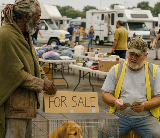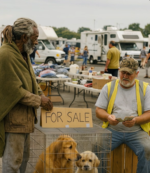 Trh pod širým nebem žil už od brzkého rána. Mezi stánky s obnošeným oblečením, starým nářadím a krabicemi plnými věcí, které kdysi někomu patřily, panoval neustálý hluk. Prodavači hlasitě nabízeli zboží, kov cinkal o kov a vzduch byl těžký prachem a pachy levného jídla.Uprostřed toho všeho stál muž v pracovní vestě. Před sebou měl kovovou klec. Uvnitř seděli dva psi.