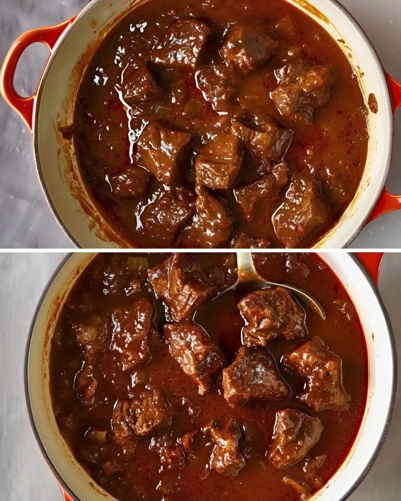 Šokující pravda? Nejde o žádnou exotickou surovinu. Hovězí maso, cibule, česnek, sladká paprika, kmín – vše známé. Ale rozdíl byl v přístupu. Maso se nikdy nekrájelo na malé kousky. Bylo velké, sebevědomé, syrové. A právě díky dlouhému tažení se změnilo v něco neuvěřitelně křehkého.Cibule bylo tolik, že by dnes mnozí couvli. Ale po hodině se rozpadla, zmizela a vytvořila hustý, temný základ omáčky. Babička se jen tiše usmála. Věděla své.