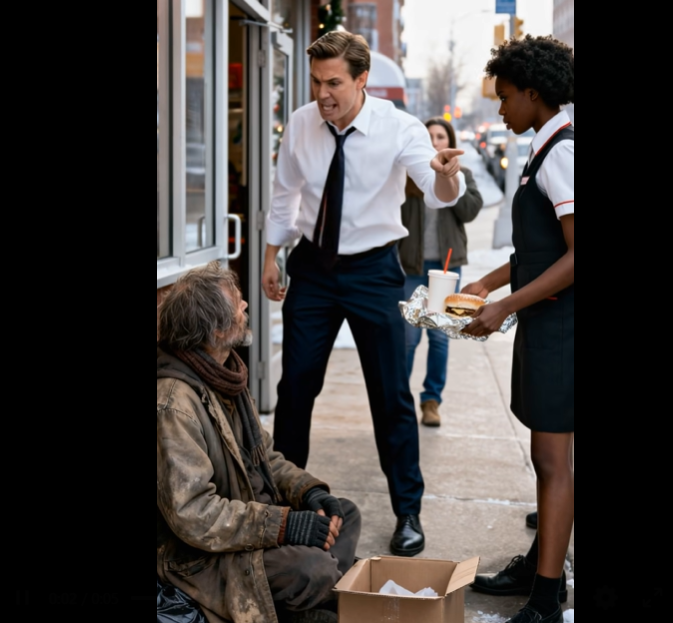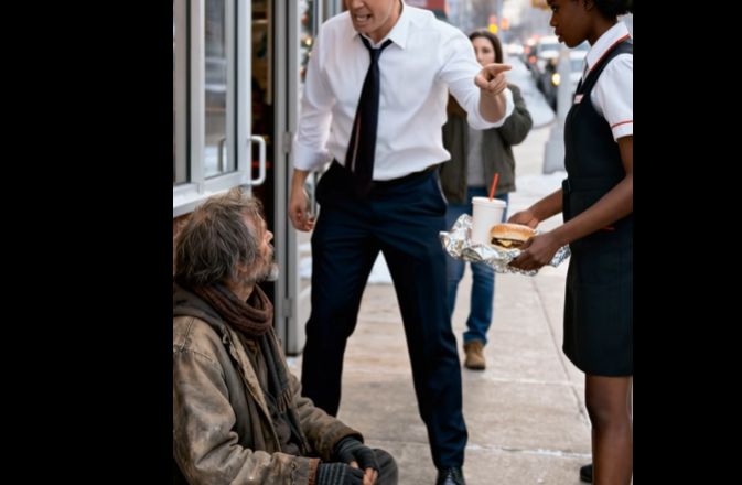 „Co si myslíš, že děláš?“ vykřikl a ukázal na talíř. „Tenhle člověk nezaplatil! U nás jídlo zdarma nedáváme! Okamžitě to vezmi zpátky.“