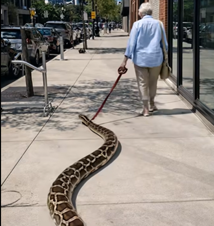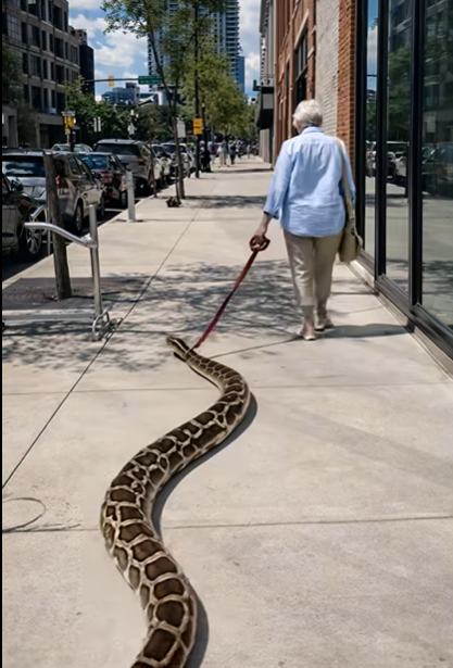 Po chodníku se pomalu, plynulým pohybem plazilo masivní tělo krajty. Had byl dlouhý několik metrů, svalnatý, s lesklými šupinami, a jeho hlava se pohybovala těsně nad zemí. Neutíkal. Neútočil. Prostě následoval ženu, jako by to byla ta nejpřirozenější věc na světě.