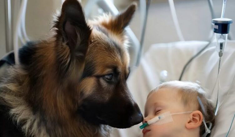 Když Rico vstoupil do pokoje, matka se leknutím posadila — nečekala, že to lékaři dovolí. Pes pomalu přistoupil k posteli, zvedl se na zadní nohy, jemně položil přední tlapky na okraj a naklonil se k chlapci. Neštěkal, nekňučel — jen se na něj díval. Pak mu jemně olízl hlavu, jako by mu chtěl dodat trochu tepla, a lehce poklepal tlapkami na hruď, jako by mu chtěl říct, že mu hodně chyběl… a zároveň se s ním loučil.