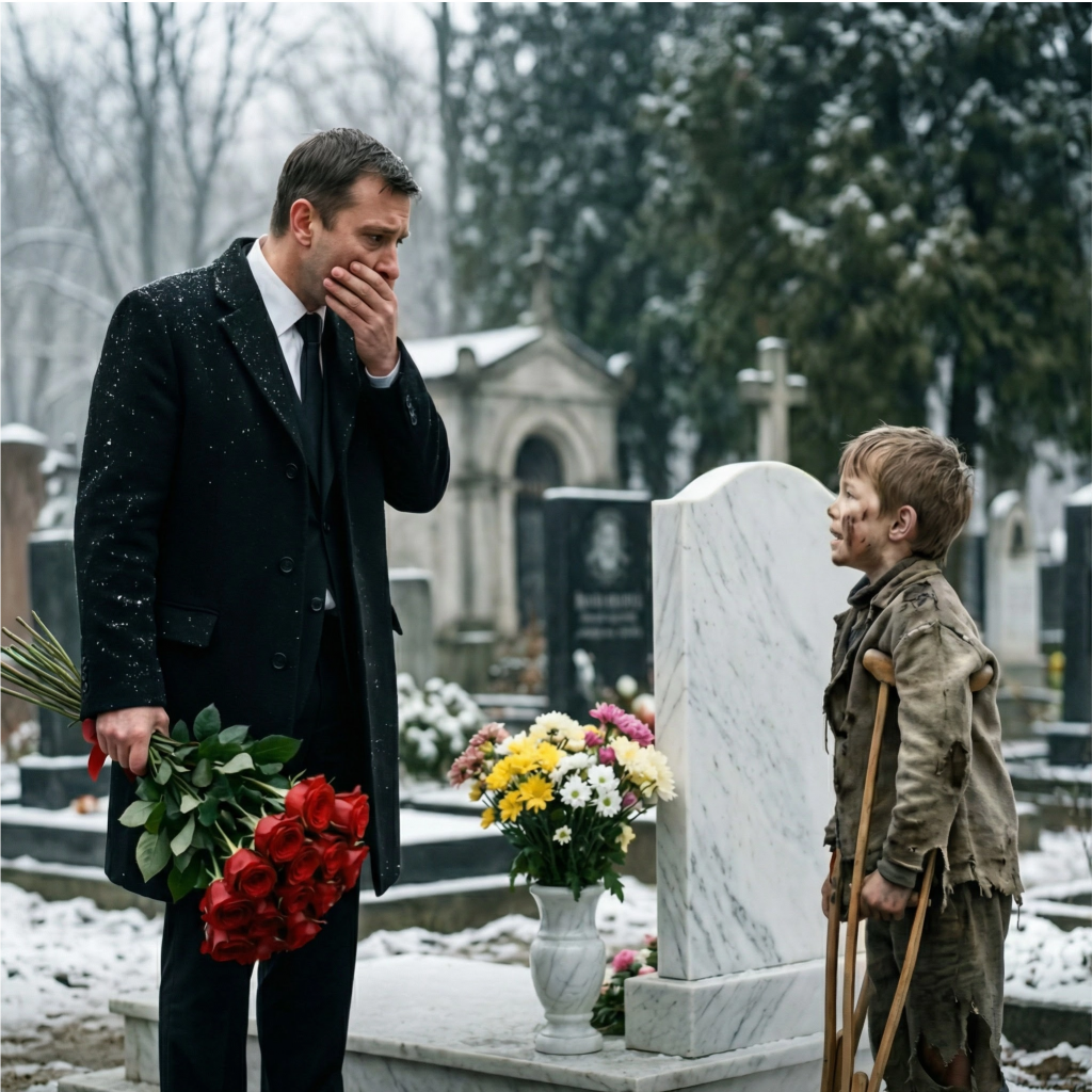 „Tati… to jsem já. Žiji,“ zašeptal bezdomovský chlapec milionáři, který přišel na hřbitov k hrobu svého syna. Když muž přistoupil blíž a pochopil, co se skutečně děje, zachvátil ho opravdový děs. 😢😱