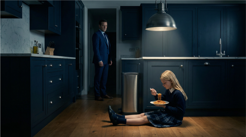 Ten večer byla kuchyň tichá a opuštěná. Lily našla keramickou misku s pár zbytky těstovin s lanýži – pro Edwarda odpad, pro ni zázrak po třech dnech bez jídla. Ruce se jí třásly. Udělala krok dopředu – a světlo se rozsvítilo. Miska vyklouzla, rozbila se, omáčka se rozlila po bílých dlaždicích.