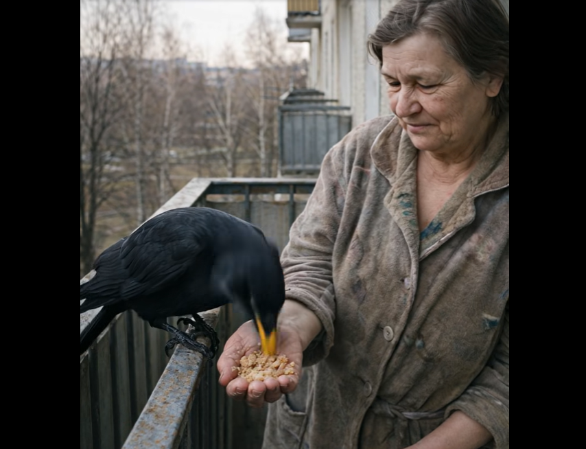 Žena žila sama. Manžel zemřel už dávno, syn se odstěhoval do jiného města a volal čím dál méně. Ráno začínalo konvicí na čaj, starým županem a kroky na balkon. A vrána už čekala — na zábradlí, s lehce nakloněnou hlavou, jako by zdravila.