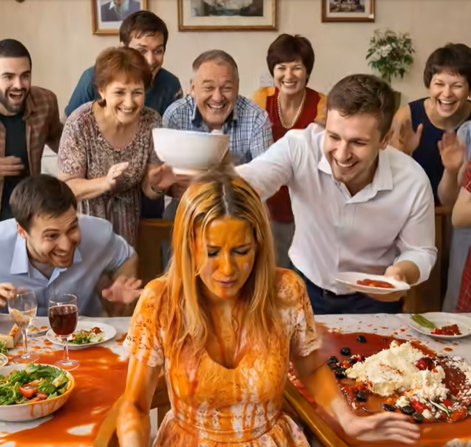 Vzal velkou mísu horké polévky. Všichni si mysleli, že pronese přípitek nebo si jen nabere. Ale v následující vteřině — bez jakéhokoli varování — vylil celý obsah na hlavu své ženy.