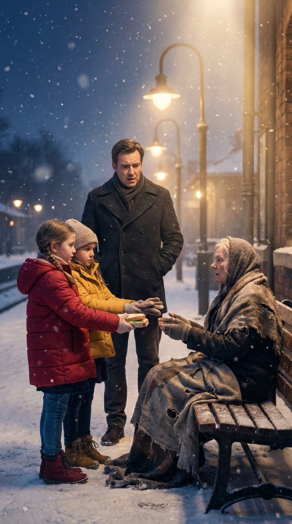 Na železniční stanici bosá bezdomovkyně třásla zimou… dokud k ní nepřišly dvě malé dívky — a ten okamžik jí úplně změnil život.