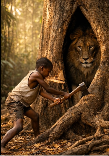 Uvnitř kmene starého, silného stromu byla velká prasklina — a uvnitř… uvízl lev. Jeho tělo bylo napůl uvnitř, tlapy měl zapřené o dřevo, zmítal se, snažil se dostat ven, ale jen se zaklínil ještě víc. Oči měl divoké, plné strachu a bolesti.